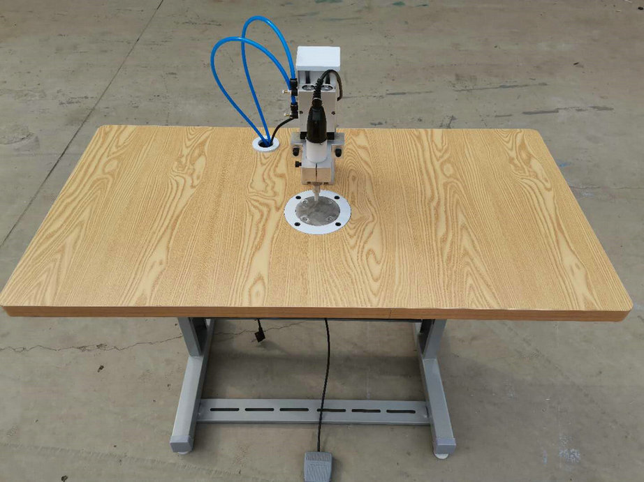 本機(jī)以超聲波將綁帶融合于口罩本體兩側(cè),進(jìn)而完成綁帶式口罩成品,只需一名操作員將口罩片置于超聲波發(fā)生器的頭上,后將綁帶放在口罩片上,腳踏踏板使氣缸向下運(yùn)動,縫住綁帶和口罩片。